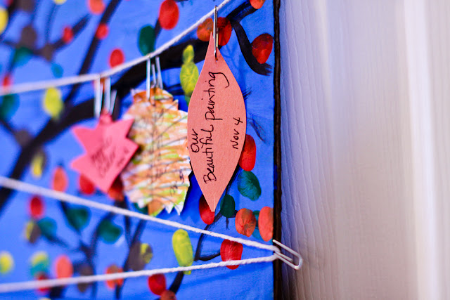 A tree of thanks for November.  We painted with acrylic paint on cardboard, made leaves with our fingertips, and attached string on which we will hang daily leaves of gratitude.