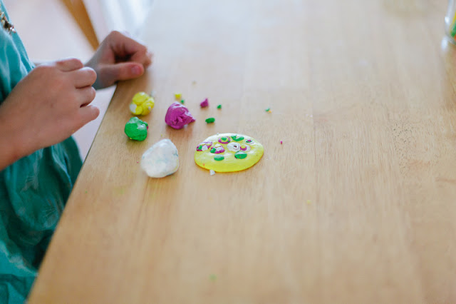 I’m pretty sure we love clay around here. It seems like the majority of my kid project posts over the years have something to do with our clay or dough creations. This project was Cedar’s idea, after we read a library book, called Mmm, Cookies!, about a boy who makes a red cookie out of clay and goes around tricking people into taking bites of it. The people make exclamative remarks about the awfulness of the taste and rinse their mouths out with toothpaste and water. Eventually the boy gets tricked into his own taste of clay cookie and in the end they all go off and make real cookies together. It is really quite silly. But our Cedar is very silly, so this book is right up his alley. He went right to work making his own red clay cookie so he can trick people into taking a bite. I’m not gonna fall for it!
